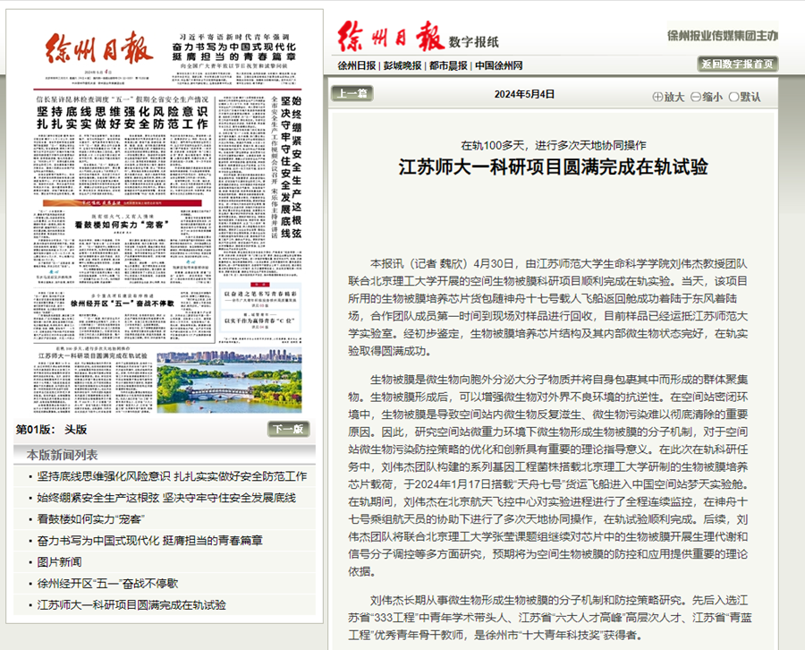 徐州日报5月4日报道(中国)官方网站科研项目在轨实验情况,报道内容如下: