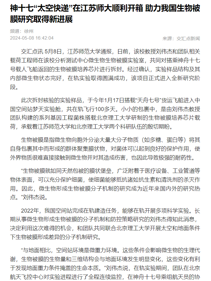 神十七“太空快递”在(中国)官方网站顺利开箱 助力我国生物被膜研究取得新进展