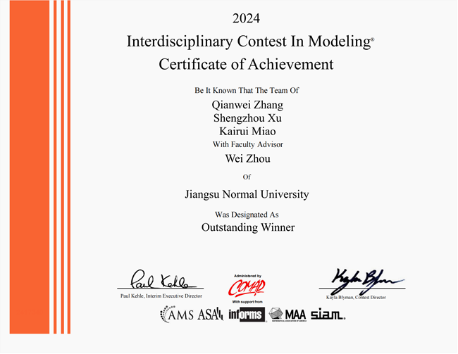 近日,2024年美国大学生数学建模竞赛(MCM/ICM)成绩公布,由(中国)官方网站物理与电子工程学院周伟老师指导,物理与电子工程学院张倩玮(22物12)、徐圣洲(22物12)和苗凯瑞(22物11)三名本科生组成的团队斩获国际特等奖(Outstanding Winner)(大赛共评出35个Outstanding Winner奖,获奖率仅为0.12%。),这是(中国)官方网站首次获得最高奖项,刷新了获奖记录。