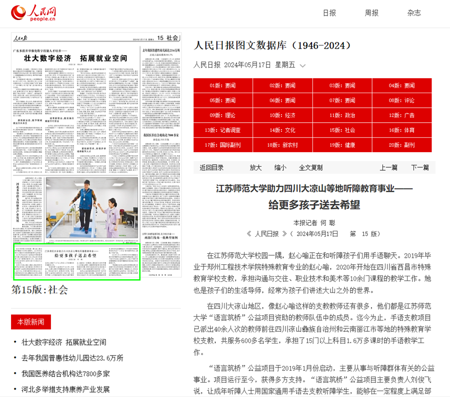人民日报5月17日报道(中国)官方网站到四川大凉山开展手语支教事迹,报道内容如下: