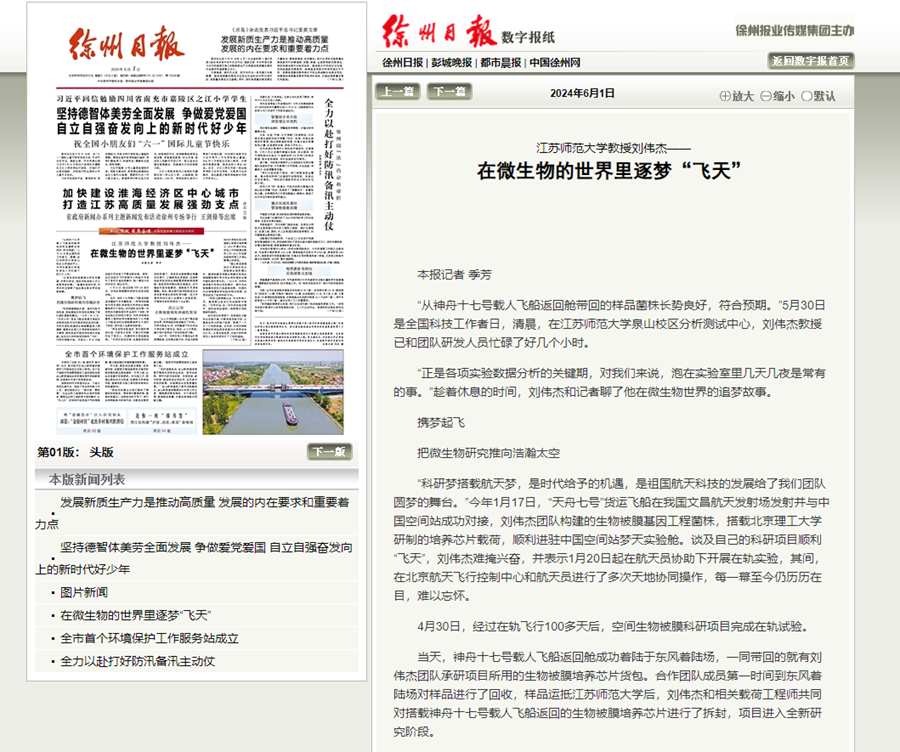 徐州日报6月1日报道(中国)官方网站刘伟杰教授团队科研成果,报道内容如下: