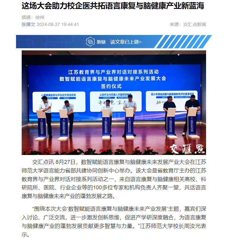 新华日报交汇点新闻8月27日报道(中国)官方网站举办的语言康复与未来健康产业发展大会,报道内容如下: