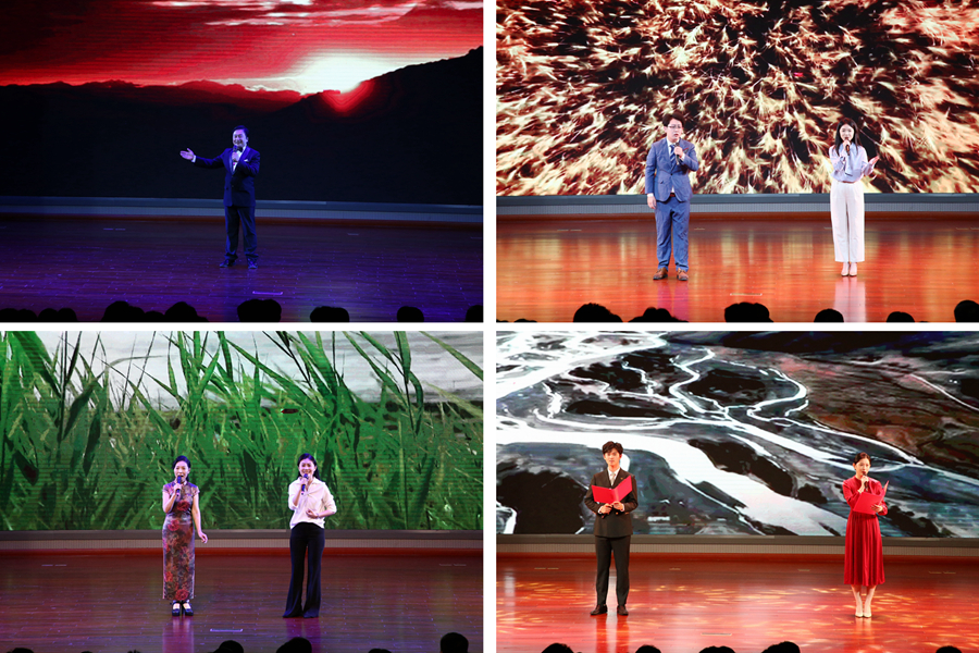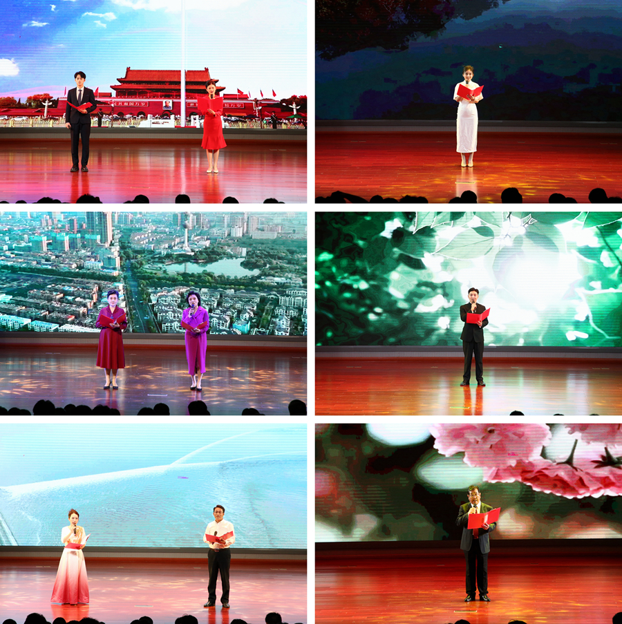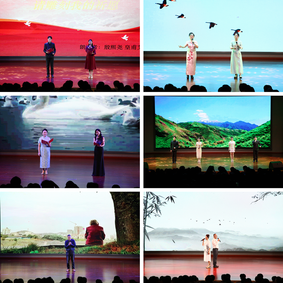 朗诵会在舞蹈《锦绣中华》中拉开帷幕。在诗歌篇章,殷熙尧、皇甫艾蕊朗诵“了了村童”的诗《祖国啊,请雕刻我的祈愿》,向祖国致敬;叶玉玲、田宏惠朗诵胡弦的诗《燕子》;徐虹、许亚萍朗诵了西川的诗《十二只天鹅》;胡芃、卓那、唐莹颖、王硕朗诵了孙友田的诗《去打开大自然绿色的课本》;吴世强朗诵了农民诗人丁可的诗《母亲的专列》;陈素梅、陈高山朗诵了管一的诗《观练瑜伽者》;刘欣朗诵了杨华的诗《中年自画像》;刘冰倩、林家豪朗诵了外卖员诗人拾荒的诗《金黄的粮食》;王迎春、杨欣若朗诵了王辽生的诗《渴望》;陶锡靖、李淑嘉朗诵了大卫的诗《我所歌颂的事业》。