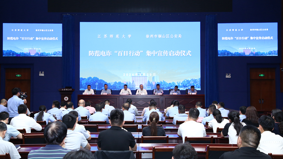 9月29日下午,学校与铜山区公安局联合开展的防范电诈“百日行动”集中宣传启动仪式在分析测试中心100报告厅举行。校党委书记方忠,铜山区政府副区长、铜山区公安局党委书记、局长陈磊出席,铜山区公安局公安干警40余人,各单位安全责任人及各学院党委副书记、安全员、辅导员代表、学生代表等160余人参加启动仪式,启动仪式由校党委常委、副校长张玉勤主持。