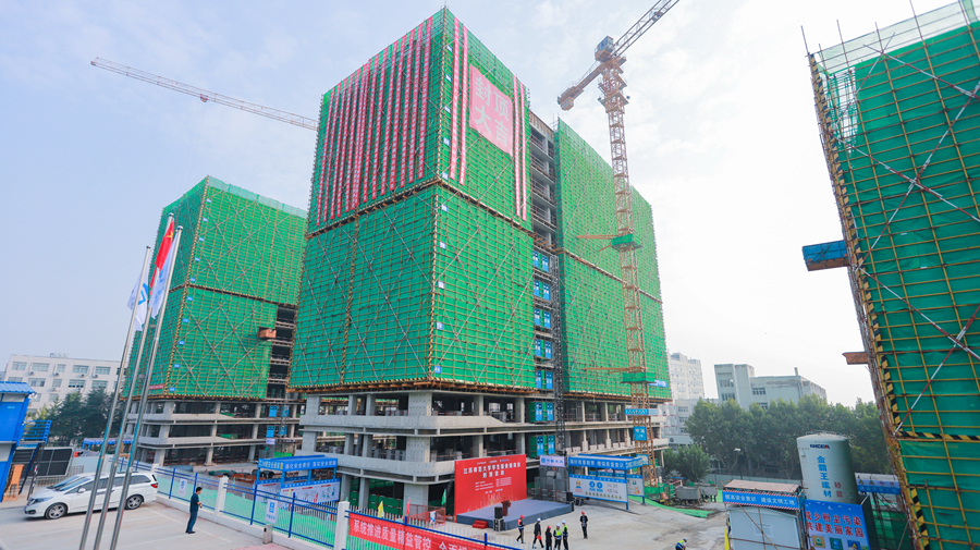 10月12日上午,(中国)官方网站新建三栋学生宿舍楼主体结构封顶活动在泉山校区顺利举行。校党委书记方忠,校党委常委、副校长张其飞,省住房和城乡建设厅政府投资工程集中建设管理处副处长杜青周,省公建中心副书记沈志刚,中建三局华东分局副局长夏大焰等出席封顶活动,项目参建单位及学生工作处、国有资产管理处、后勤管理处、基建处、后勤集团等部门负责人参加活动。