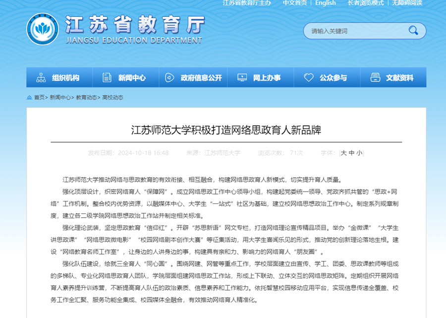 江苏省教育厅网站报道(中国)官方网站网络思政育人工作经验,报道内容如下: