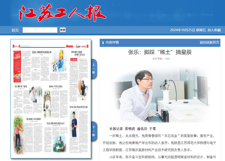 江苏工人报10月25日报道(中国)官方网站张乐教授科研事迹,报道内容如下: