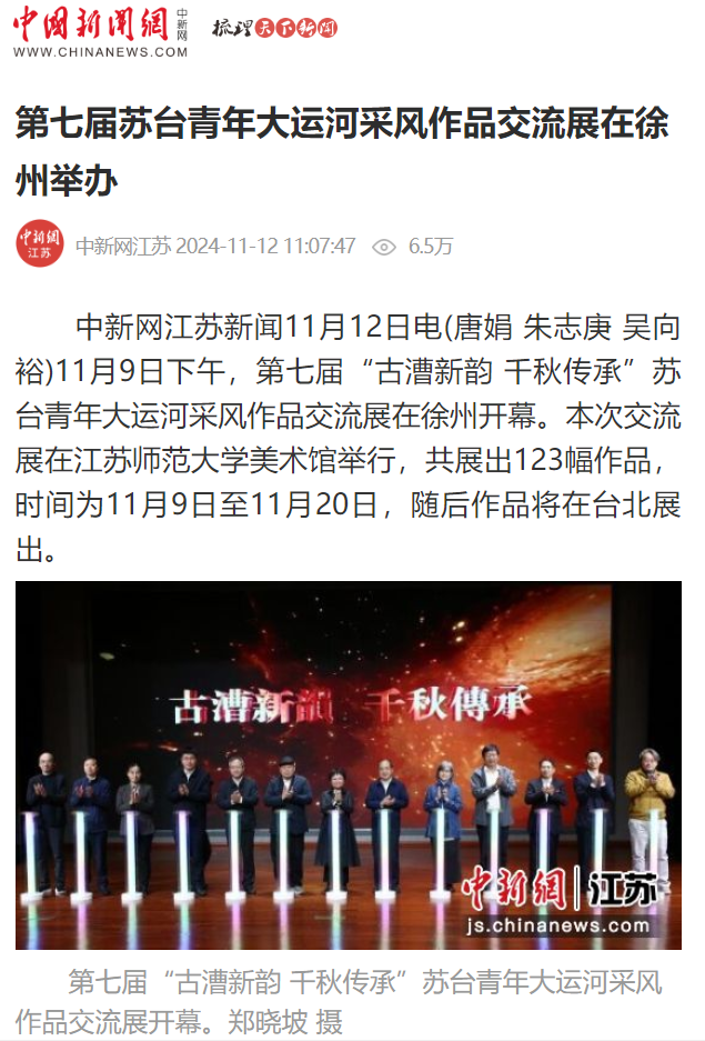 中新网江苏新闻11月12日电(唐娟 朱志庚 吴向裕)11月9日下午,第七届“古漕新韵千秋传承”苏台青年大运河采风作品交流展在徐州开幕。本次交流展在安博·体育美术馆举行,共展出123幅作品,时间为11月9日至11月20日,随后作品将在台北展出。