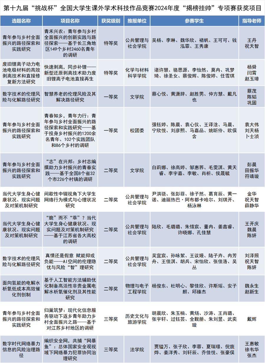 在第十九届“挑战杯”全国大学生课外学术科技作品竞赛“揭榜挂帅”专项赛中,《青禾兴农:青年参与乡村全面振兴的创新实践与路径探索——基于长三角地区149个乡村2460名青年的调研》《快速剥离,同步补锂——新型还原剥离技术助力废旧锂离子电池直接再生》荣获特等奖,《青春知乡,青年力行:青年参与乡村全面振兴的路径探索和实践研究——基于投身乡村振兴的1200余名青年、102个实践团队和86个乡村的调研》《智慧养老的伦理风险及其解决路径研究》荣获一等奖,《“志”在兴邦:乡村志编撰助力乡村振兴的青春实践——基于全国8个省32个市226个村镇的调研》《间歇性中辍视角下大学生网络行为模式与心理状况研究》《“脆”而不“萃”?当代大学生身心健康状况、现实问题及对策机制研究——基于江苏省各大高校的调研》《真情还是假意赋能抑或负能——AI空间的伦理隐忧与风险“智”理研究》《基于人工智能方法辅助优化制备高活性非贵金属电解水析氧催化剂及其性能研究》荣获二等奖,《归巢筑梦:现代化信息服务驱动下返乡青年助力乡村全面振兴之路——基于对江苏乡村地区的调研》《编织安全网,共捕“网暴鱼”:总体国家安全观视域下网络暴力犯罪协同治理研究》荣获三等奖。