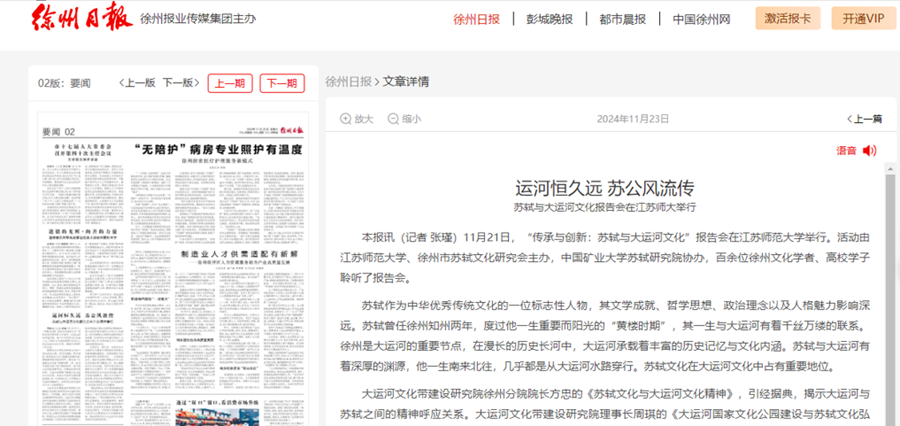 徐州日报11月23日,报道在(中国)官方网站举办的苏轼与大运河文化报告会,报内容如下: