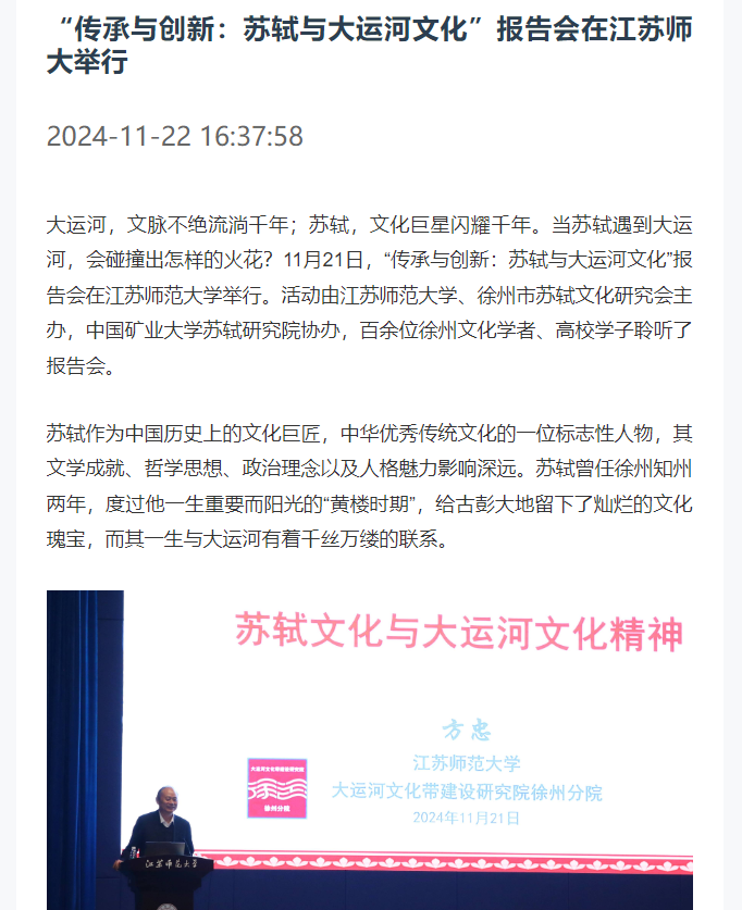 徐州日报汉风号11月22日报道在(中国)官方网站举办的“传承与创新:苏轼与大运河文化”报告会,报道内容如下: