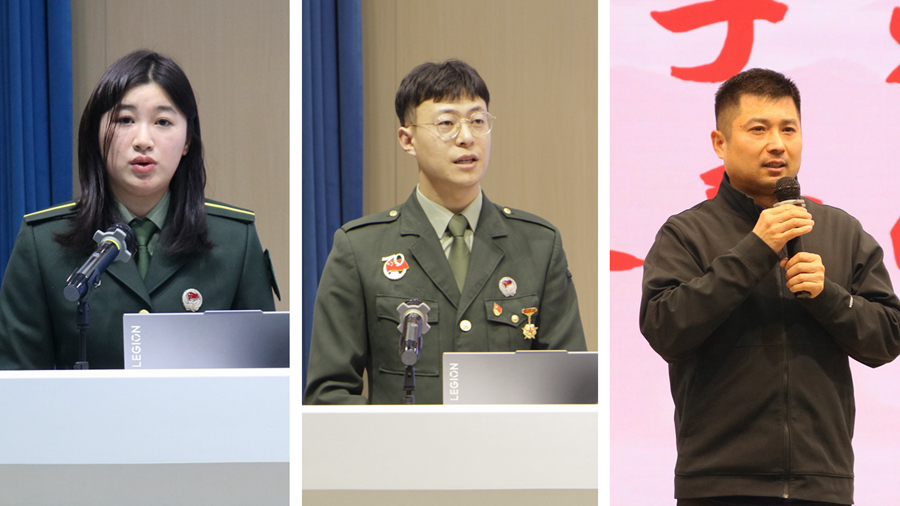 活动现场,三位“最美退役大学生”代表结合自身的亲身经历,围绕军旅生活讲述关于青年学生携笔从戎培塑家国情怀、助力强军伟业、绽放绚丽青春的鲜活事迹。来自法学院的2023级法学专业研究生詹其飞同学,以“在新战场续写新荣光”为题,生动诠释了一名多次参与抗洪抢险、抗震救灾并两次荣立二等功的新时代军人的使命担当,退伍后为了更好服务社会而“潜心求学,增智报国”的感人故事。来自智慧教育学院的2022级教育技术学研究生糜泽稼同学,以“无悔青春,正步仪仗”为题,叙述了一名普通高职生在军营中蜕变成长为多次参与仪仗司礼任务的军队仪仗兵,退伍后凭着在部队锤炼出的意志品质华丽转身成为一名硕士研究生的奋斗故事。来自体育学院的2022级体育教育专业本科生郭张若瑀同学,讲述了一段将“流血流汗不流泪”的军人精神转化为为国争光动力的“军人与泳者”,退伍后依托专业所长不断学习成长,继续奉献社会的青春故事。