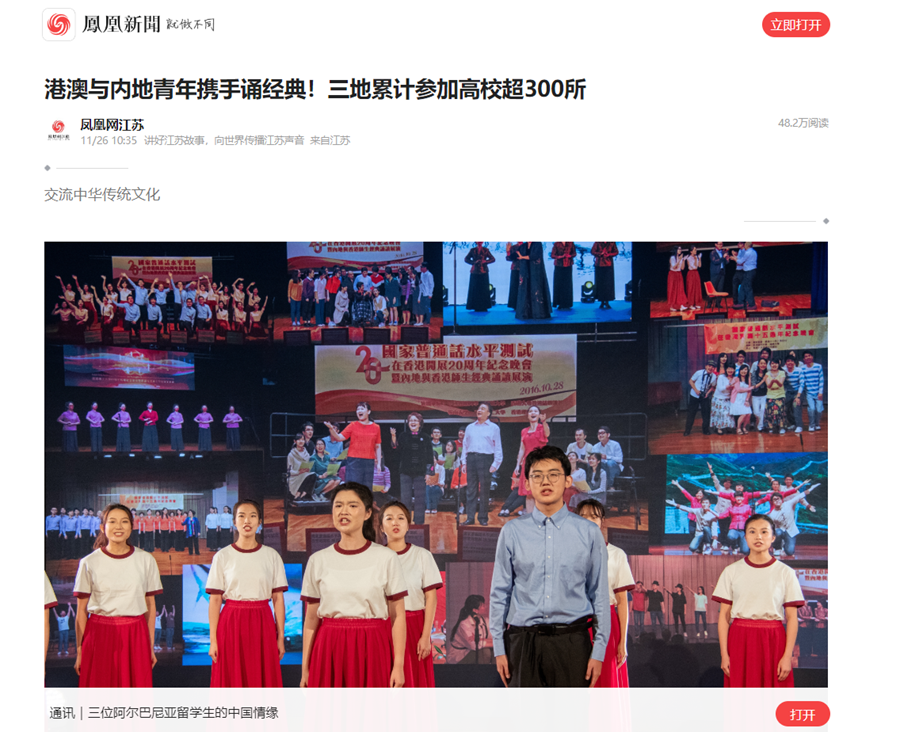 凤凰新闻网11月26日报道(中国)官方网站语言科学与艺术学院到香港开展经典诵读交流有关信息,报道内容如下: