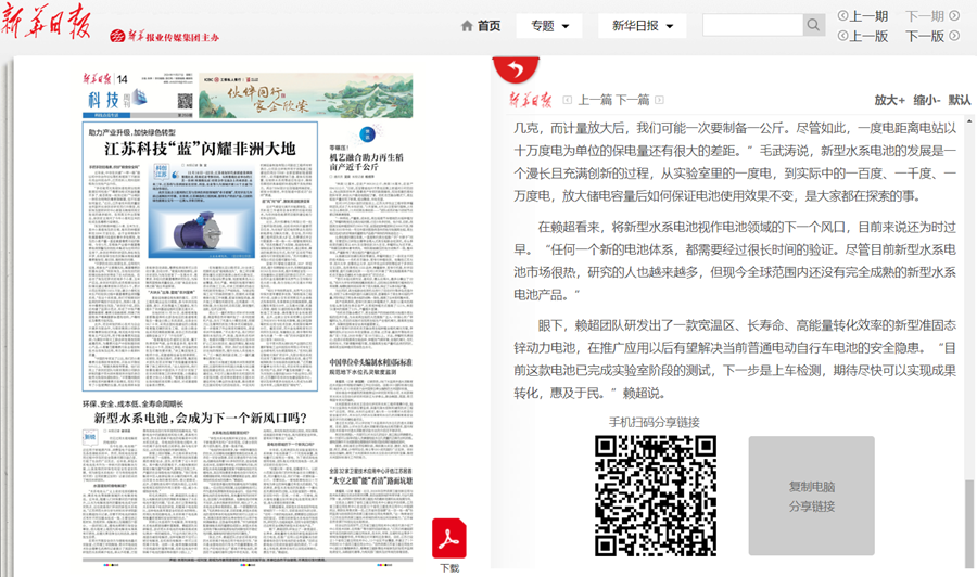眼下,赖超团队研发出了一款宽温区、长寿命、高能量转化效率的新型准固态锌动力电池,在推广应用以后有望解决当前普通电动自行车电池的安全隐患。“目前这款电池已完成实验室阶段的测试,下一步是上车检测,期待尽快可以实现成果转化,惠及于民。”赖超说。