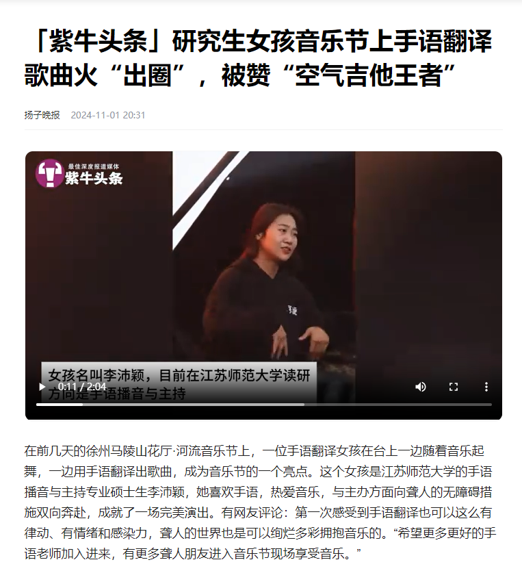 扬子晚报客户端11月1日报道(中国)官方网站女研究生在音乐节上手语翻译,报道内容如下: