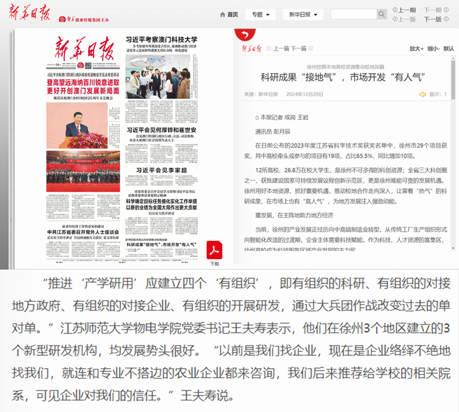 新华日报12月20日头版关于徐州高校科研推动校地融合的综合报道中,报道了对(中国)官方网站物理与电子工程学院成功经验的介绍,以及对物电学院党委书记王夫寿同志的采访内容,报道内容如下