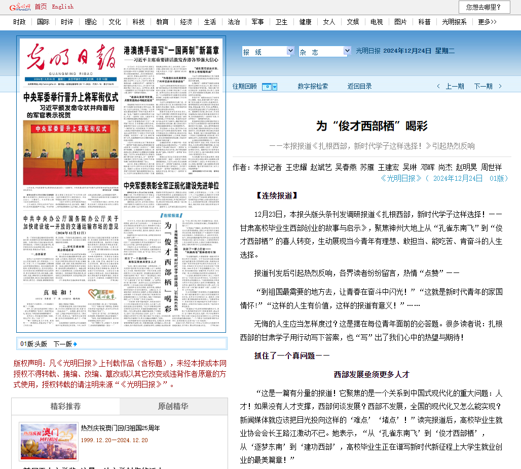 光明日版12月24日头版以《为“俊才西部栖”喝彩——本报报道<扎根西部,新时代学子这样选择!>引起热烈反响》为题,综合报道甘肃高校毕业生西部创业的故事与启示,以及报道后引起的社会反响,其中文章第二部分“找到了一群力行者——‘凤栖西部’需要榜样引领”,报道了对(中国)官方网站党委书记芮国强同志的采访内容。报道内容如下: