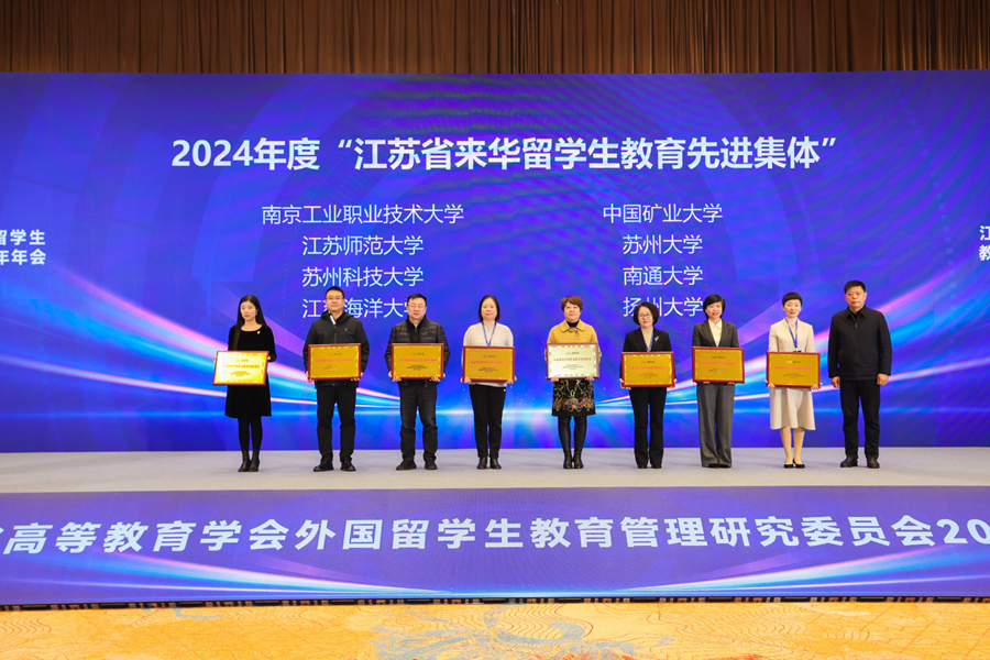 2024年12月29日至31日,江苏省高等教育学会外国留学生教育管理研究委员会年会在无锡召开。大会上对来华留学生教育先进集和个人进行了表彰,(中国)官方网站获江苏省“来华留学生教育先进集体”称号,这是(中国)官方网站第五次获此殊荣。(中国)官方网站国际学院甄宇彤老师被授予2024年度江苏省“外国留学生教育管理先进个人”、王晓蒙老师被评为2024年度江苏省“优秀留学生辅导员”。