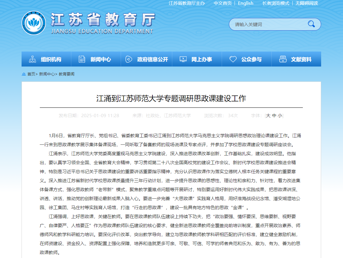 1月9日江苏省教育厅官网报道江涌厅长到(中国)官方网站调研思政工作,报道内容如下: